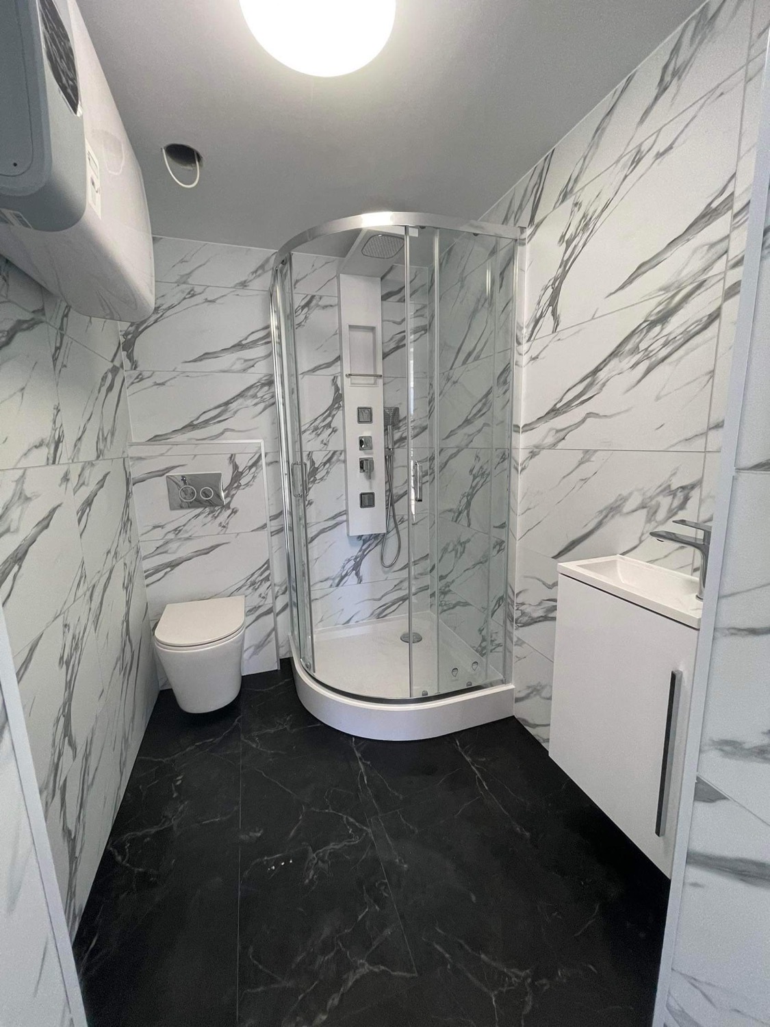 A fehér márvány mintázat luxus és elegancia sugárzását kölcsönzi a térnek!
